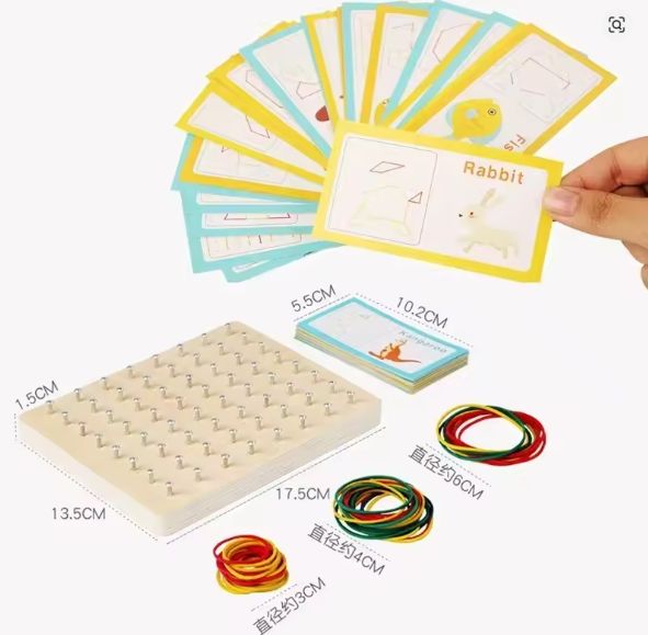 El Juego de Madera Montessori Tablero de Clavos con Tarjetas y Ligas es una herramienta educativa diseñada para estimular la creatividad, la concentración y las habilidades motoras finas de los niños. Fabricado en madera resistente y segura, este tablero Montessori se convierte en el aliado perfecto para el aprendizaje a través del juego.