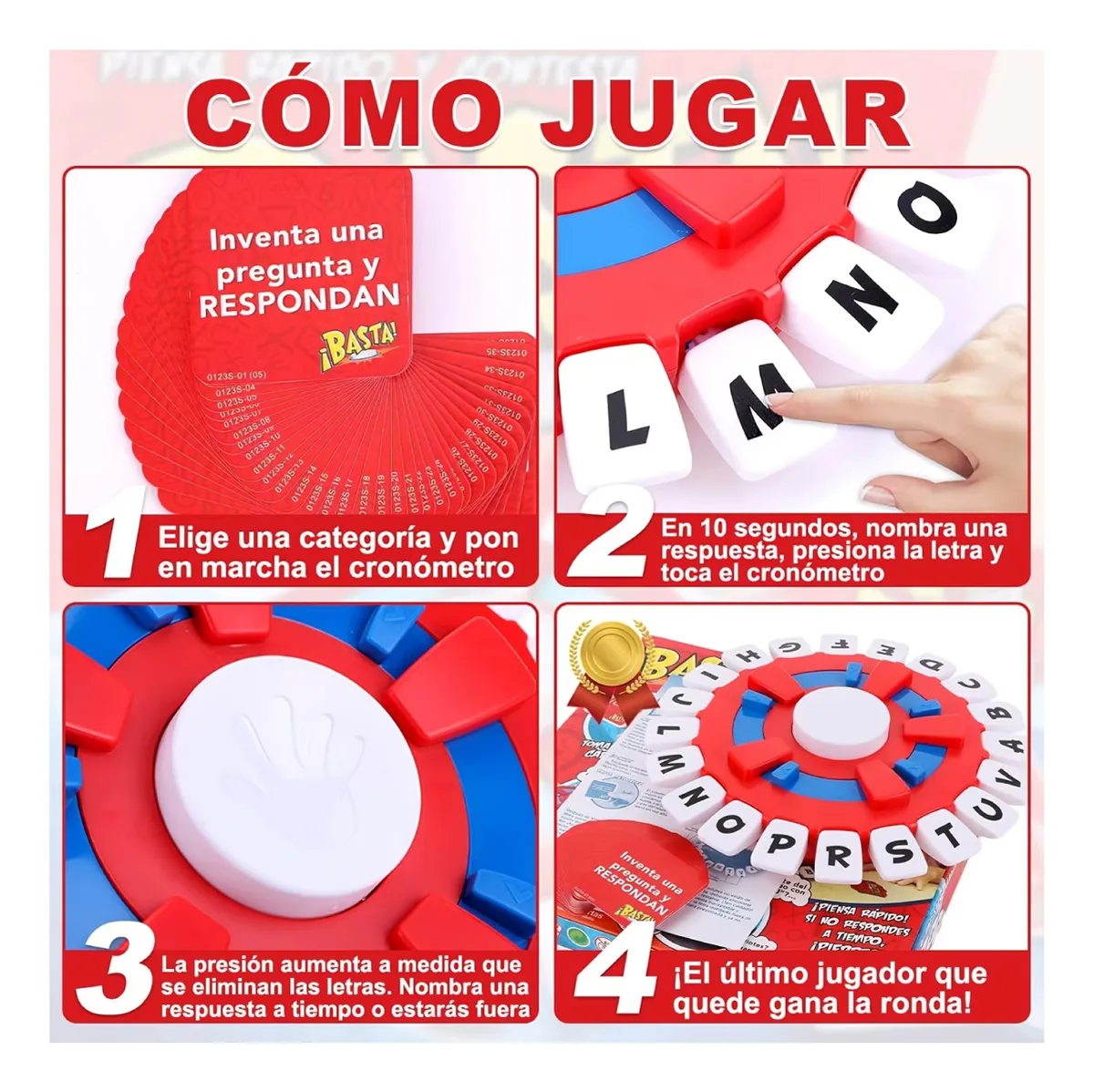 Cada jugador toma una carta de categoría y se selecciona una letra en el dispositivo. Con el cronómetro en marcha, los participantes deben decir o escribir palabras que empiecen con esa letra antes de que el tiempo se acabe. Cuando alguien completa su respuesta, grita “¡Basta!” y se baja la letra usada para continuar con una nueva ronda.