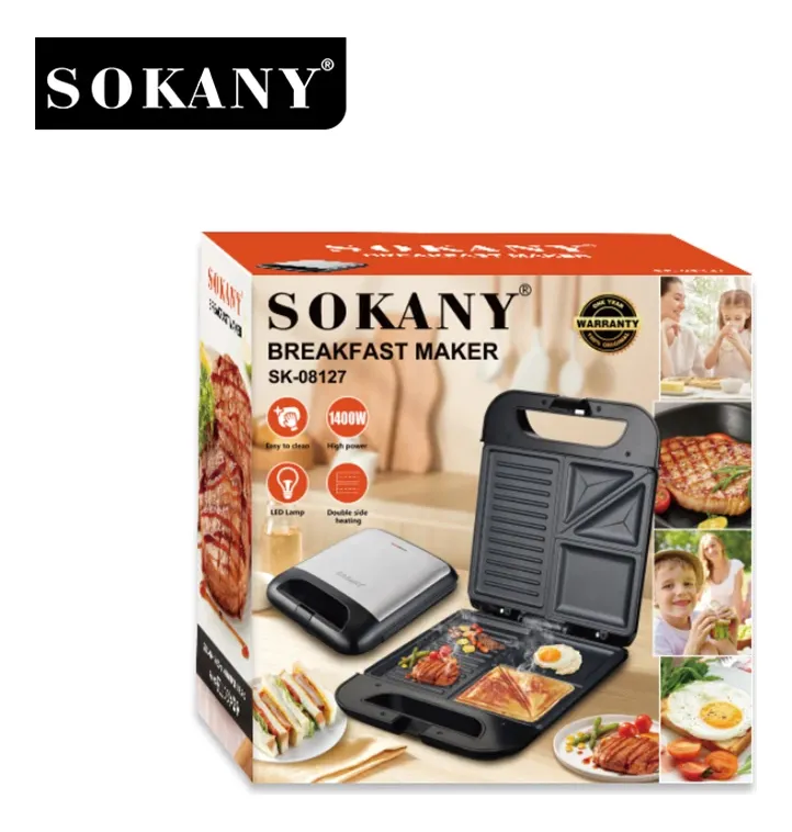 La Sanduchera Multifuncional Sokany 3 en 1 SK-08127 de 1400W es el equipo ideal para quienes buscan preparar sándwiches, parrillas, grill y planchas de forma rápida, eficiente y con resultados profesionales. Diseñada para uso diario, esta sanduchera eléctrica combina potencia, versatilidad y durabilidad, convirtiéndose en un imprescindible para cualquier cocina moderna en Ecuador.